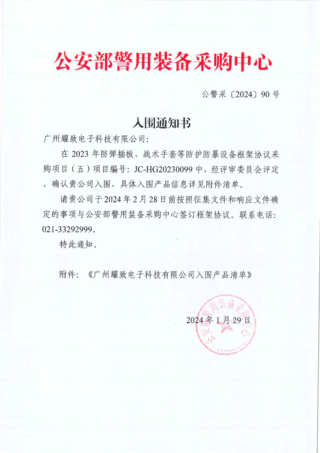 2024年1月29日,公安部警用装备采购中心(012)公布了“公安部警用装备采购中心2023年防弹插板、战术手套等防护防暴设备框架协议采购项目(五)入围结果公告”,并向广州耀致电子科技有限公司发布通知函,其应急型警用急救箱(内含AED)产品成功入围012公安部,将被全国各地公安部落地使用。广州耀致电子科技有限公司携手科曼医疗,将科曼AED大力推广,以高品质应急型警用急救箱(内含AED)助力公安部门完善国内各大场所应急配置。