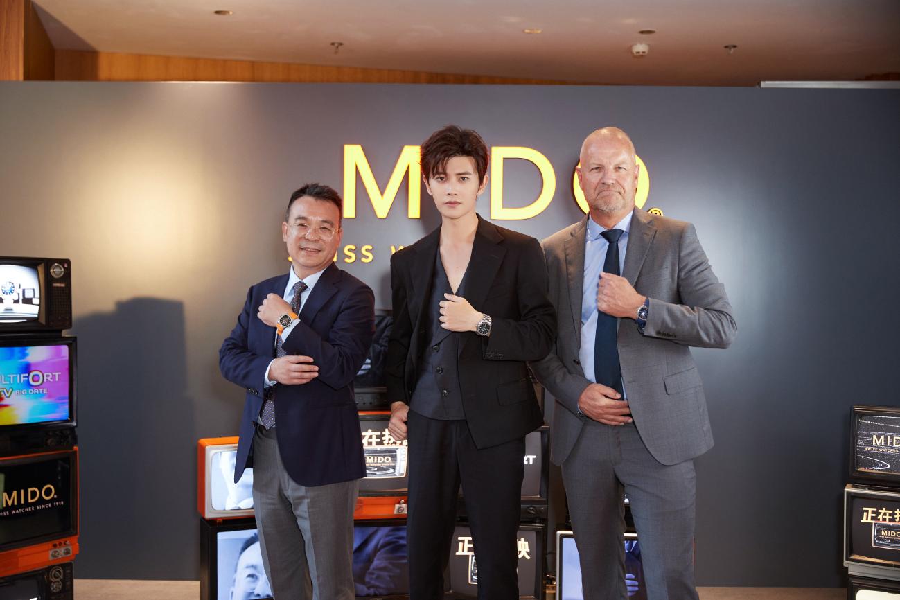 从左至右:瑞士美度表中国区副总裁张利民、瑞士美度表品牌代言人任嘉伦、瑞士美度表全球总裁Franz Linder