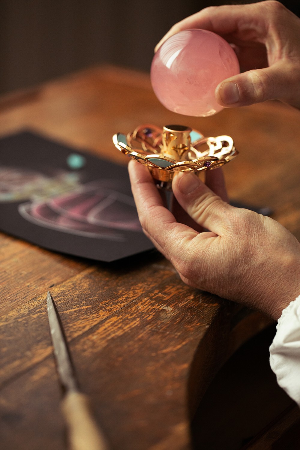 L'Opera Mediterranea Serenissima地中海圣光赞歌高定宝石香水其瓶盖镶嵌共计18.9克拉的珍贵宝石,包含两颗黄水晶、两颗紫水晶、两颗粉碧玺与四颗绿松石,其瓶盖顶部则镶嵌着一颗重达1,689克拉的壮丽玫瑰石英。L'Opera Mediterranea Divinissima地中海深蓝乐章高定宝石香水其瓶盖则饰有共计22.6克拉的珍贵宝石,包含两颗粉碧玺、两颗绿橄榄石、两颗钻石和四个珍珠母贝面,其瓶盖顶部镶嵌一颗重达1,962克拉的圆形天青石,这些旖旎宝石释放浓郁而饱满的色彩,经位于罗马的宝格丽高级珠宝工坊大师的匠心巧手,通过细腻切工和镶嵌,方得以展现。在宝格丽工匠的细致雕琢之下,人们仿佛通过瑰丽非凡的珠宝瓶身便能感知封存于内的醉人馨香。