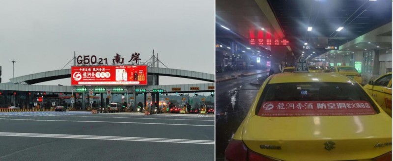 除此之外,龙洞香还在重庆高速路、出租车上投放了户外广告,搭配醒目的产品图和简约明了的宣传标语,将“龙洞香酒”之名随着出租车的行驶走遍大街小巷,覆盖到各大消费群体之中,进一步增强品牌曝光度,强化用户对龙洞香品牌认知,助力龙洞香短时间内抢占迅速抢占市场,加强经销商赋能。