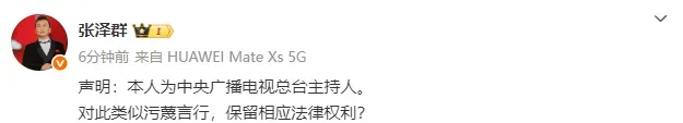 主持人张泽群否认被央视开除!近日,有网友称主持人张泽群被央视开除。4月25日,张泽群愤怒发文反驳,声明自己为中央广播电视总台主持人,并表示对此类污蔑言行保留法律权利。他还晒出了一张截图,显示有网民在评论区询问他为何被央视开除,张泽群回复说凭这条就可以起诉对方,并请对方自重。