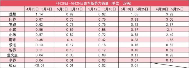 在三个品牌合力下,5月19日-5月25日,蔚来公司合计销量为0.65万辆;4月28日-5月25日,蔚来公司累计销量为2.45万辆,超过了小鹏,仅比小米低0.04万辆,预计本月销量在2.6万-2.7万辆的水平。