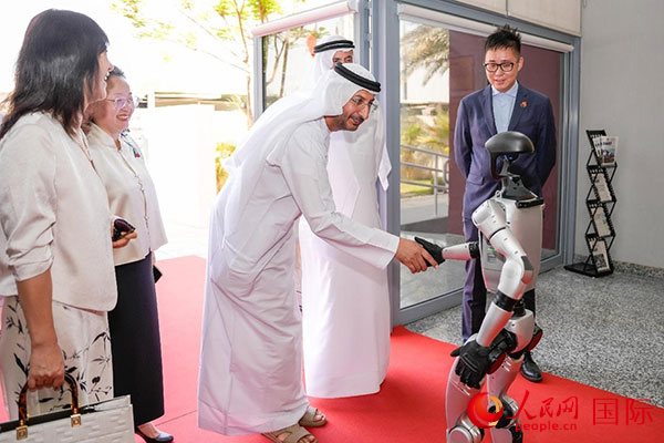 机器人在迪拜中国学校门口迎宾。人民网 塔里克·易卜拉欣摄