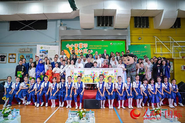 中外嘉宾和孩子们共绘《掌心树影》。人民网 塔里克·易卜拉欣摄