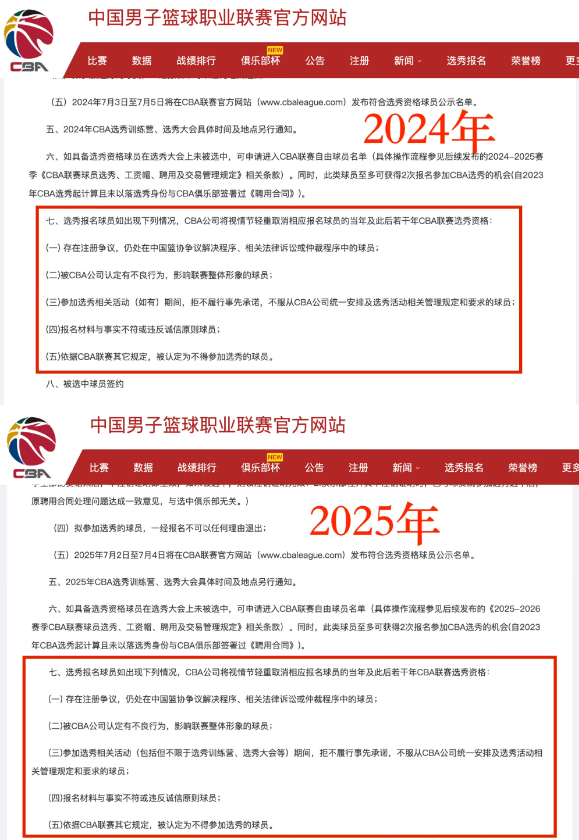 CBA制定“杨政条款”?媒体人晒图辟谣:这是假新闻 网友误解引发热议!近日,“杨政条款”在网上引发热议,有人称CBA为了防止选秀再出现类似杨政的闹剧,在今年的选秀规定中新增了两条,违反者将被取消该年或之后若干年的选秀资格。杨政被选中后第一次体测没有通过,后来也没有参加补测,遭到广泛吐槽。杨政本人也对体测表示不满,直言“17折(测试)没用”。因此,网友称CBA推出了“杨政条款”。