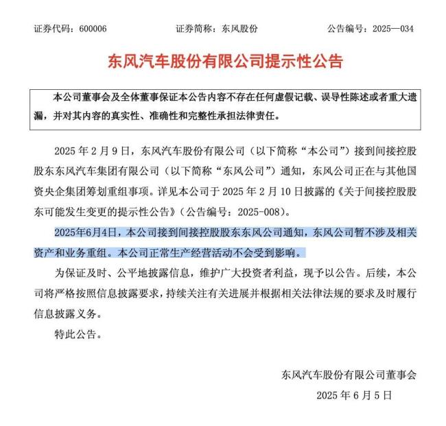 同日,东风汽车发布公告称,2月9日公布的正在与其他国资央企集团筹划重组事项。因接到间接控股股东东风公司通知,暂不涉及相关资产和业务重组。与此同时,该公司正常生产经营活动不会受到影响。