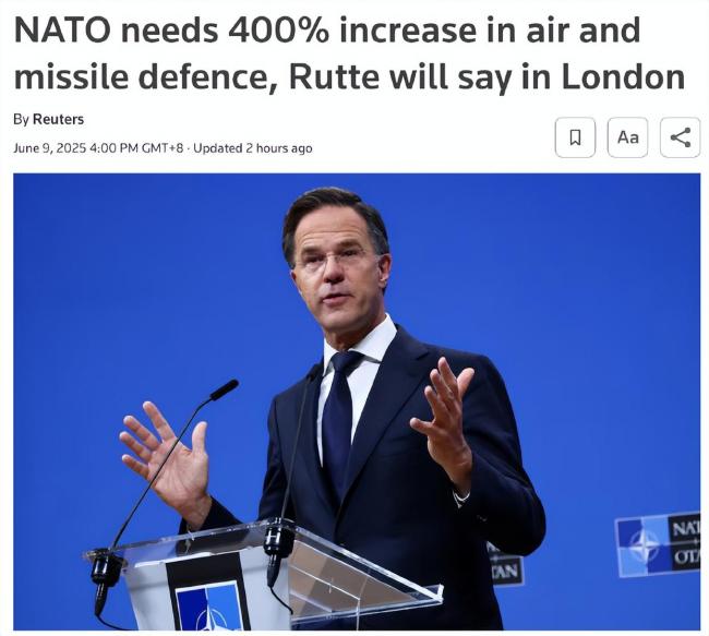 北约秘书长马克·吕特计划在伦敦发表讲话,呼吁北约成员国大幅提高防空和导弹防御能力,目标是实现400%的提升。他还推动各成员国将国防支出增加到国内生产总值的3.5%,并额外将1.5%的GDP用于更广泛的安全相关支出,以响应美国总统特朗普提出的“5%目标”要求。吕特预计这一目标将在6月24日至25日举行的峰会上达成共识。