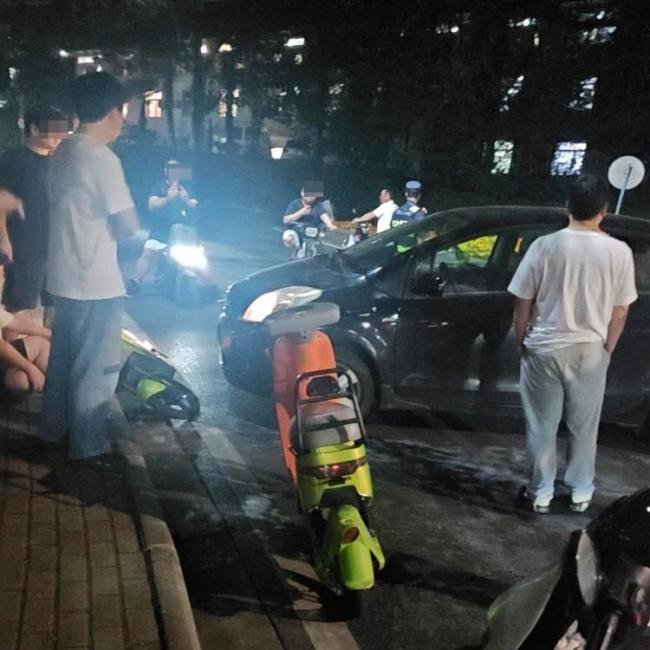 6月16日,在读研究生小涂(化名)告诉媒体,他于5月18日20时45分左右到达事发现场。现场照片显示,一辆黑色汽车横向停在路边,车头前有一辆共享电动自行车倒在马路牙子上,另有两辆共享电动自行车就近停靠。穿制服的工作人员正在现场处理。