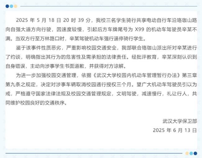 武汉大学保卫部通报称,鉴于该事件性质恶劣,严重影响校园交通安全,该部联合珞珈山派出所对辛某进行了约谈,明确指出其行为的危害性及需承担的法律责任。经批评教育,辛某深刻认识到自身错误,主动向涉事学生书面道歉,并获得对方谅解。为进一步加强校园交通管理,决定对涉事车辆取消校园通行授权3个月。