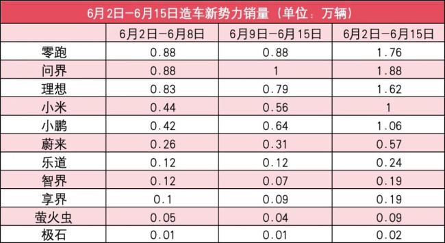 理想继续排在第三位。6月9日-6月15日,理想销量为0.79万辆,较前一周下滑了0.04万辆。这也是理想近2个月以来,首次周销量跌破0.8万辆。6月2日-6月15日,理想累计销量为1.62万辆。有消息称,理想连续2周销量下滑的原因之一是近期的权益退坡。不过,其上周新增订单又恢复增长,反弹到0.9万辆左右。