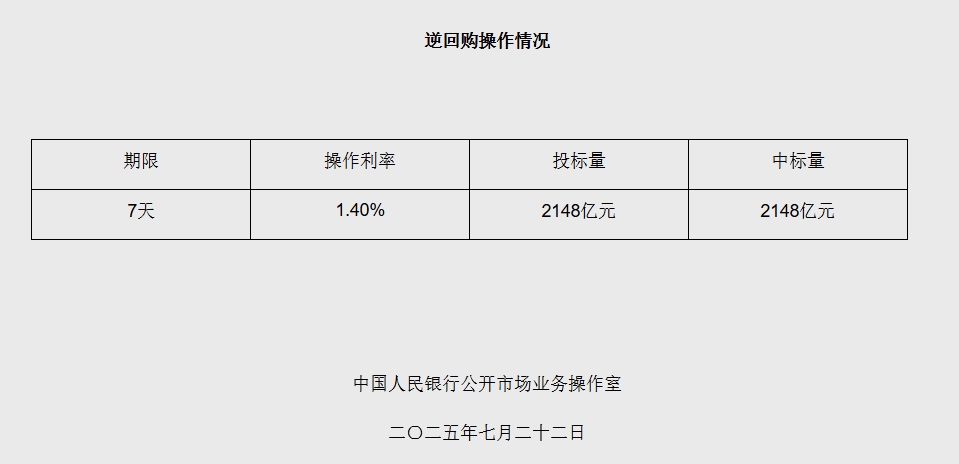 中新网7月22日电 据央行网站消息,2025年7月22日中国人民银行以固定利率、数量招标方式开展了2148亿元逆回购操作。具体情况如下: