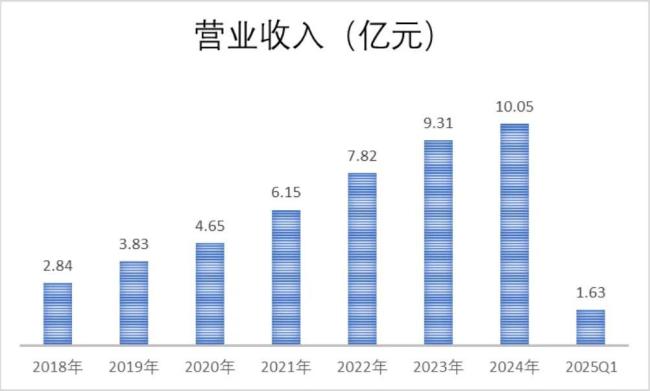 营收方面,从2018年的2.84亿一路增长至2024年的10.05亿,复合增长率达到23.45%,2025年一季度延续增长势头,同比增长11.48%至1.63亿。