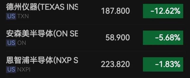 德州仪器股价暴跌超过12%。美国模拟芯片股多数下挫,安森美半导体一度大跌近8%,恩智浦半导体一度跌超4%,目前跌幅有所收窄。此前,德州仪器在周二美股盘后公布的业绩展望不及市场预期。该公司第三季度营收预测为44.5亿至48亿美元,营收指引中值略高于预期;每股收益指引中值低于分析师预期。德州仪器还强调,未来关税不确定性将影响客户需求。最新财报显示,德州仪器第二季度业绩超出预期,营收同比增长16%,净利润同比增长15%。其中,模拟芯片业务贡献显著,主要服务汽车和工业用途的传统半导体市场。