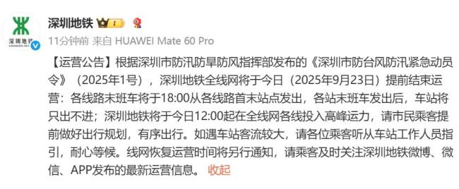 深圳地铁提前结束运营。根据深圳市防汛防旱防风指挥部发布的紧急动员令,深圳地铁全线网将于2025年9月23日提前结束运营。各线路末班车将在18:00从首末站点发出,之后车站将只出不进。自今日12:00起,深圳地铁将在全线网各线投入高峰运力。请市民乘客提前做好出行规划,有序出行。如遇车站客流较大,请听从工作人员指引,耐心等候。具体恢复运营时间将另行通知,请关注深圳地铁微博、微信和APP获取最新运营信息。