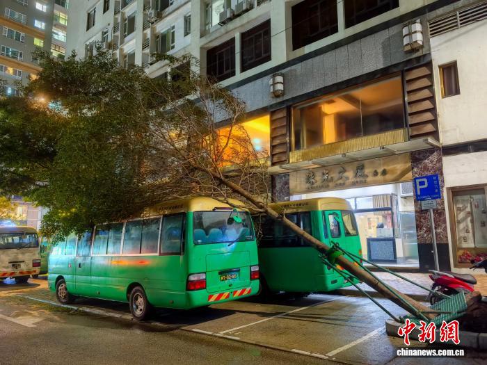 9月24日,受台风“桦加沙”影响,澳门多处树木被强风吹倒。图为树木被吹倒并压在车辆上。中新社记者 郑嘉伟 摄