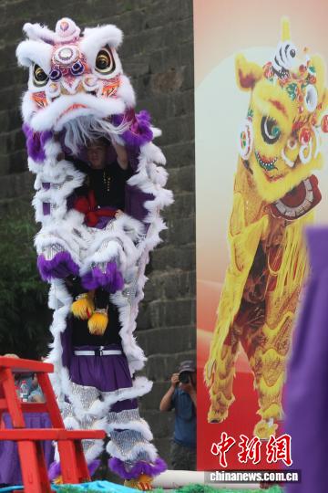 9月27日,在江苏南京举行的2025年世界华人狮王争霸赛传统南狮项目的比赛中,来自中国、新加坡、南非、美国等国家的参赛队伍轮番登台展绝活。图为深圳市宝安区西乡蚝业黄连胜醒狮团的成员在比赛中。中新社记者 泱波 摄