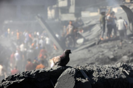 2023年10月26日,在加沙地带南部城市汗尤尼斯,一只鸽子停留在以军袭击后留下的建筑废墟上。新华社发(亚西尔·库迪摄)