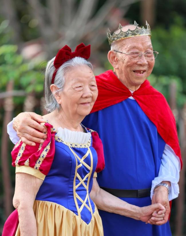 10月8日,网友们在网上分享自己在上海迪士尼看到的一对老人,他们穿上了王子公主的装扮,在迪士尼游玩,吸引了许多游客的目光。摄影师@羊饿了在社交平台分享了这对“老王子”“老公主”的拍摄花絮。爷爷已经91岁,奶奶89岁,家中四世同堂。两人拍照时的互动依然充满爱意。
