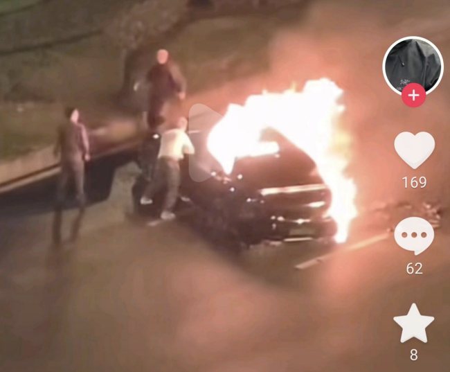 视频显示,多人尝试用拳砸、脚踹等方式破窗,并使用灭火器喷射驾驶位,但因车窗玻璃无法击破且火势蔓延迅速,救援受阻。