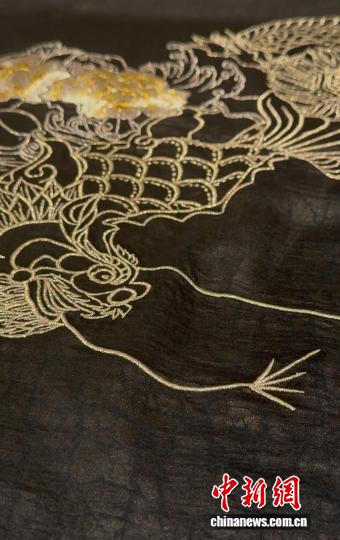 在中国华侨历史博物馆“纱韵岭南——中国香云纱文化艺术展”的展厅内,一条黑色香云纱潮绣长围巾格外惹眼。其表面的金色锦绣图腾,吸引不少观众驻足观赏。