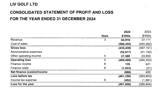 LIV Golf Ltd是LIV Golf注册在英国的公司实体,负责管理这个由沙特公共投资基金(PIF)支持的新贵高尔夫联盟在美国以外的活动,我们简称它为LIV国际。根据其公司集团账目,尽管该公司在2024年收入同比增长74.9%至6490万美元,但仍远低于去年支付的5.53亿美元的运营成本,净亏损升至4.618亿美元。这也意味着LIV Golf自2021年成立以来的三个财年,其国际业务现已亏损11亿美元,这还不包括单独核算的美国业务。