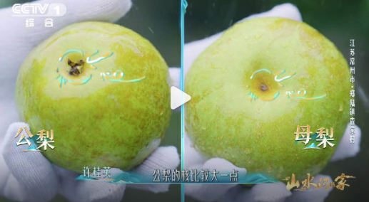 江苏常州查家村盛产翠冠梨,脆甜无渣,个大饱满,但果核小。这里的果农手一掂就知梨重9两2。村民介绍,梨子的甜度与公母有关,母梨比公梨甜。如何区分公母?只需查看梨子底部的“肚脐”,公梨底部带叶,母梨的底部则比较光滑。