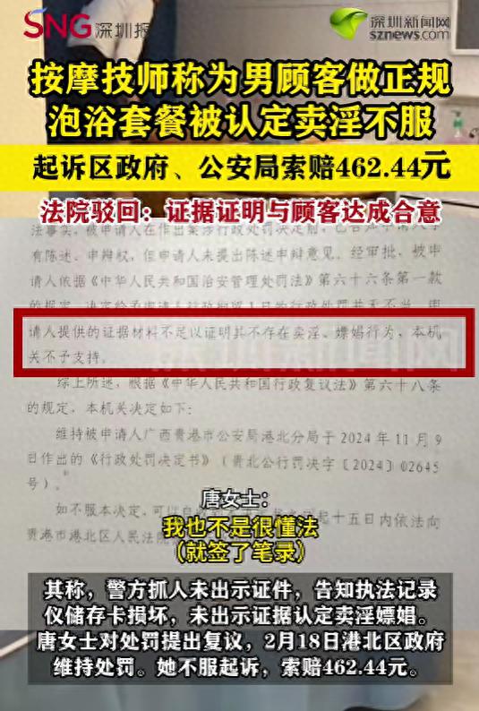 女技师做488元按摩套餐被认定卖淫 起诉被驳回!女技师被认定涉黄拘留1天后起诉警方。近日,广西贵港按摩技师唐女士称,去年为顾客做泡浴服务时,被警方以提供涉黄服务拘留一天。次日又遭全身赤裸检查和二次审讯。 其称,警方抓人未出示证件,告知执法记录仪储存卡损坏,未出示证据认定卖淫嫖娼。唐女士对处罚提出复议,2月18日港北区政府维持处罚。她不服起诉,索赔462.44元。9月26日,法院驳回,经查明,唐女士及顾客叶某、另一名技师谭某某的笔录中,均提及488元套餐含涉黄服务,证据证明其与顾客达成卖淫嫖娼合意,警方执法合规。