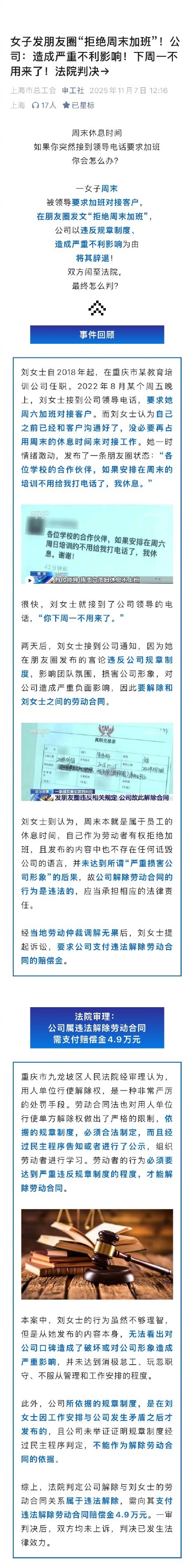 一名女子因拒绝周末加班,在朋友圈发文表达不满后被公司辞退。双方最终闹至法院,事情有了结果。