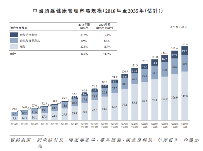 数据显示,我国脱发患者由2018年的2.71亿人增至2024年的3.39亿人,复合年增长率达3.8%,预计2035年将达到4.68亿人。