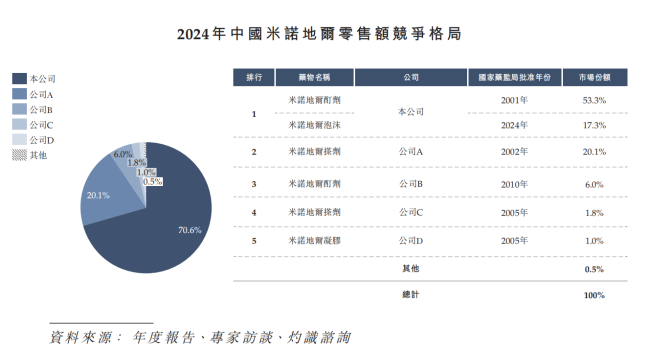 据灼识咨询数据,以零售额计,蔓迪国际旗舰产品蔓迪米诺地尔类脱发治疗产品,自2014年起,已连续十年在中国脱发药物市场、米诺地尔类药物市场排名第一。2024年,在上述两个市场的占有率分别达到57%和71%。