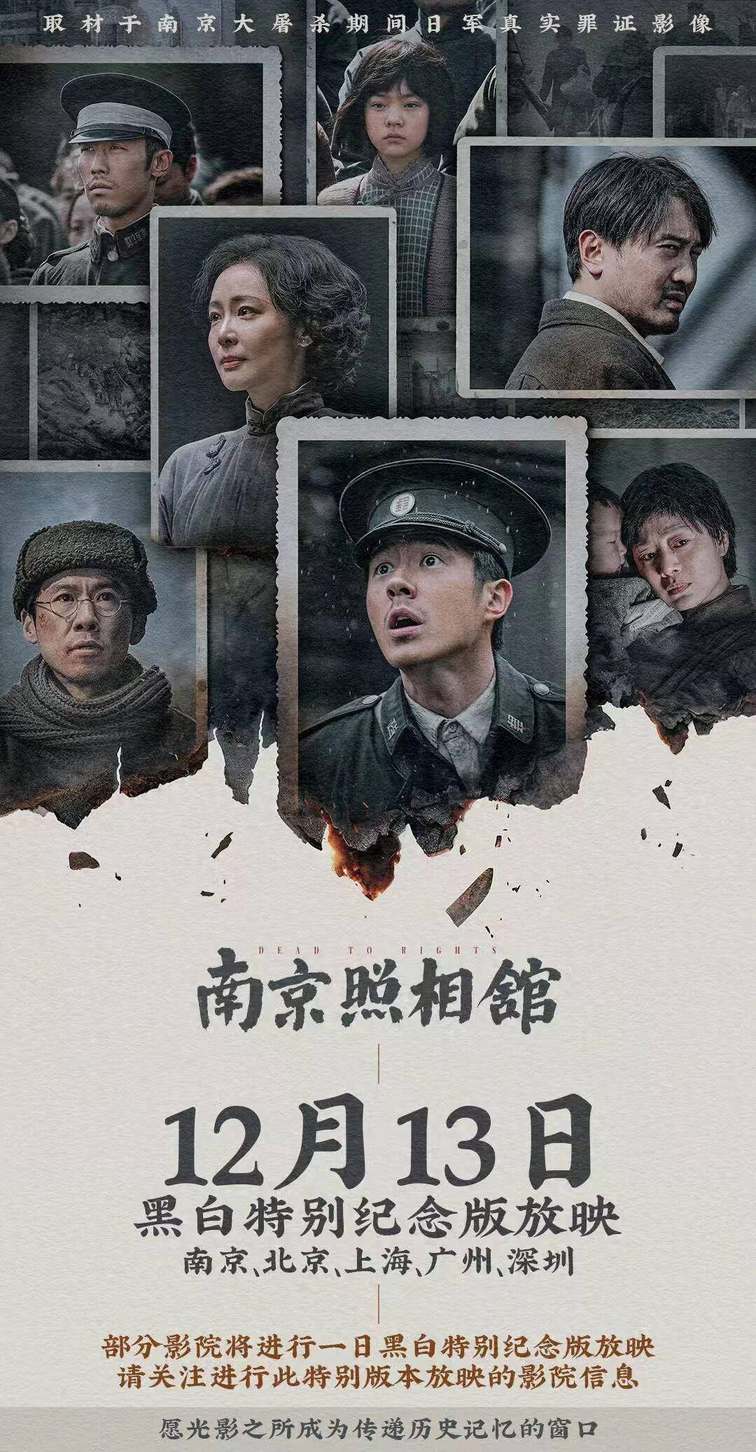 12月13日将特别放映《南京照相馆》。据@电影南京照相馆消息,12月13日,电影《南京照相馆》黑白特别纪念版将开启一日放映,在南京、北京、上海、广州、深圳5座城市的40家影院与影迷见面。据悉,将上映的南京16家影院覆盖南京所有区。