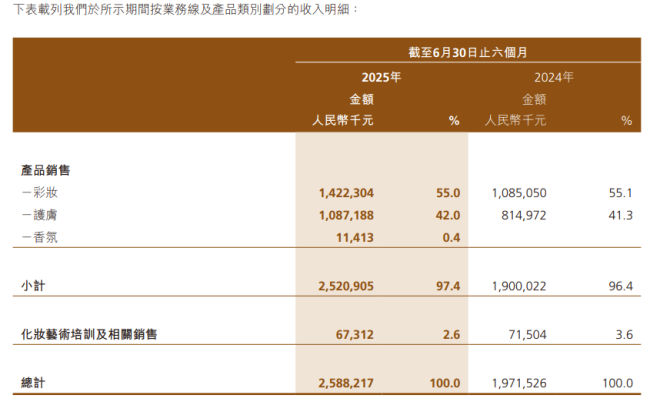 毛戈平发布2025年中期报告显示,2025年1-6月,公司实现营业收入25.88亿元,同比增长31.28%;净利润为6.7亿元,同比增长了36.11%。其中,彩妆作为毛戈平的核心业务,营收为14.22亿元,同比增长31.06%,营收占比为55%。渠道方面,2025年上半年,毛戈平线上渠道营收为12.97亿元,同比增长39.01%,营收占比为51.4%;线下营收为12.24亿元,同比增长26.58%,营收占比为48.6%。