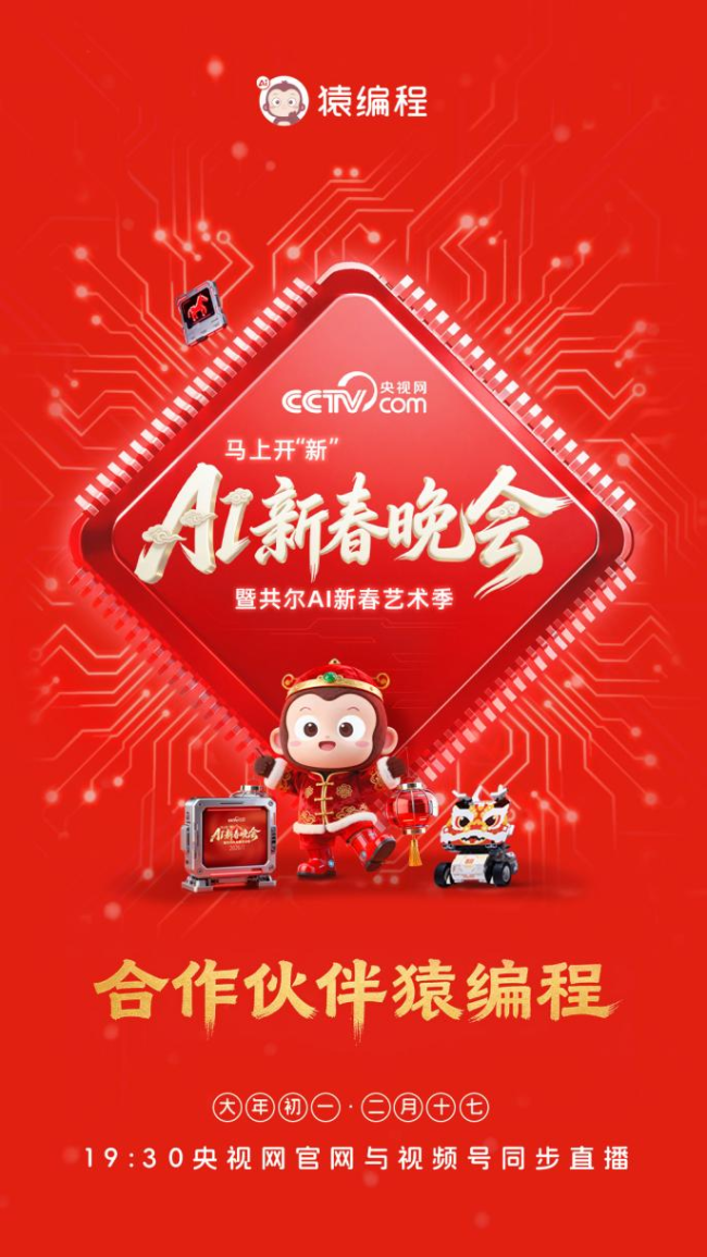 2026年央视网AI新春晚会,即将在2月17日(农历大年初一)19:30揭开神秘面纱,这场融合尖端科技与传统年味的创新盛宴,将首次迎来青少年人工智能教育品牌的加盟助力——猿编程将作为核心合作伙伴参与本届AI新春晚会制作,不仅带来自主研发、集成AI功能的编程机器狗“小8”(猿编程8号)登台拜年,还将呈现《AI编年史》《马年去哪串个门》等原创节目,向全国观众展现中国青少年在人工智能时代的创新风采与教育成果。