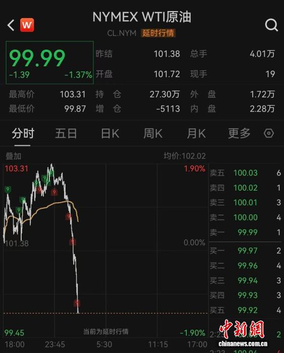 中新网4月1日电(记者 谢艺观)4月1日,国际油价突然跳水,WTI原油失守100美元/桶,布伦特原油一度失守101美元/桶。(完)