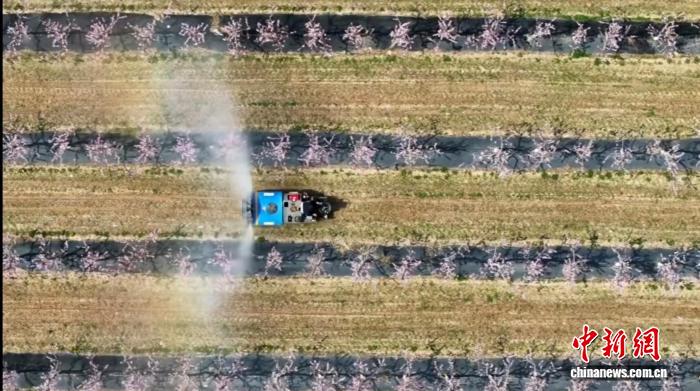 春日时节,山西万荣南景村,农机穿梭于盛开的桃林间,开展灌溉作业,为桃树生长提供充足水分(航拍图)。万荣县融媒体中心供图